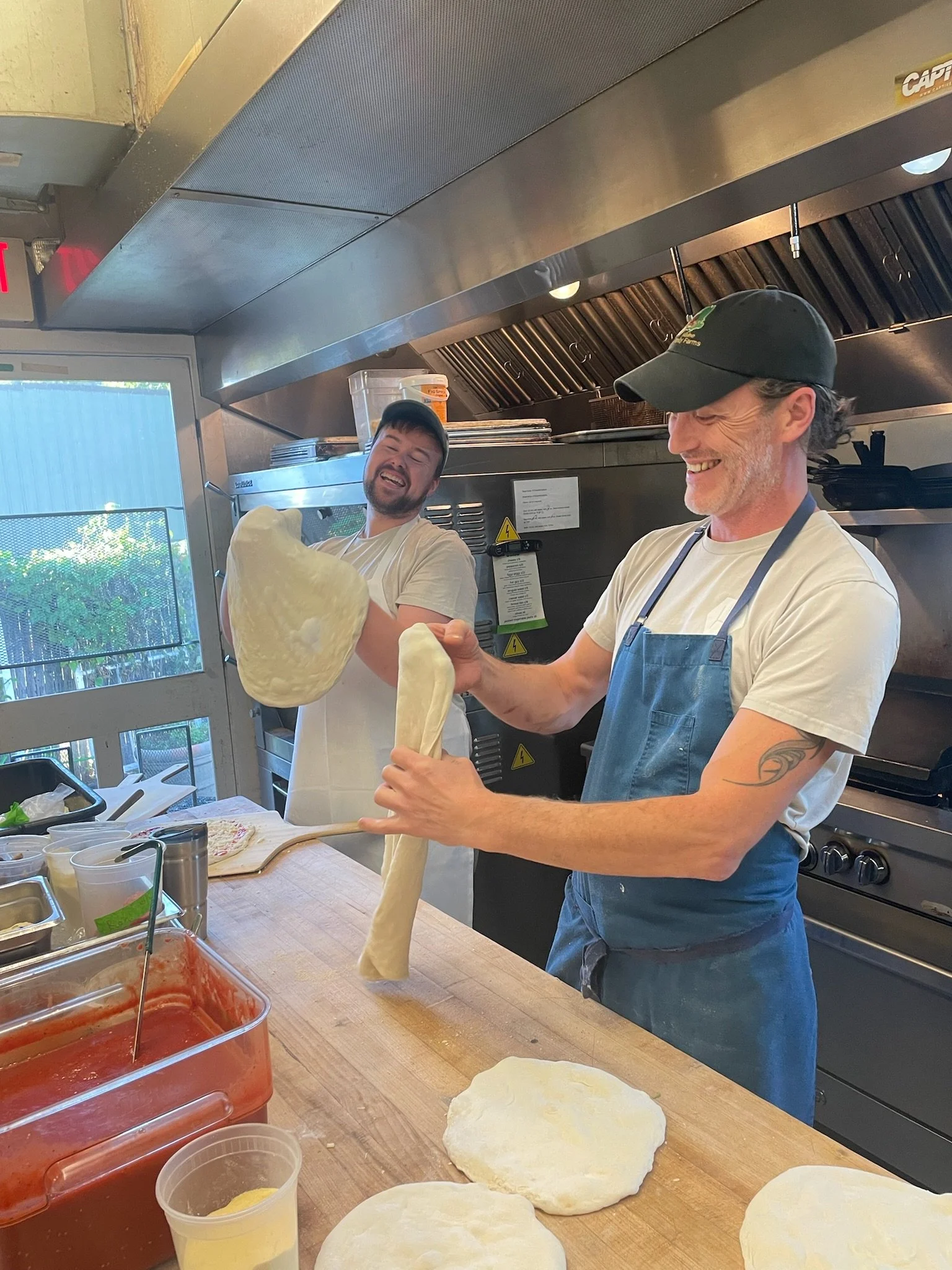 Our Pizzas are 14” each and our crust is made with Sourdough. Every week we have Cheese & Pepperoni and have a variety of rotating seasonal flavors. We use our house-made marinara and our three-cheese blend.